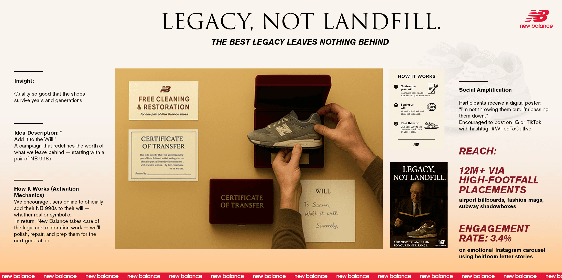 Problem People treat sneakers like fast fashion: buy often, wear hard, then throw them away. Even when a pair survives for years, it is rarely repaired, passed on, or seen as something worth keeping. That means even well-made shoes end up in a landfill instead of carrying their stories forward. Insight The things we protect in a will are not the most expensive, but the ones that carry our stories. A watch, a record player, a jacket from a big life moment. If a pair of shoes lasts long enough and witnesses enough life, it can feel like an heirloom, too. When something is good enough to put in your will, it is too meaningful to ever become waste. Idea Add It To The Will New Balance turns its most durable sneaker into something people legally leave behind. Through a simple microsite, owners of NB 998s can officially “add them to the will,” name a future heir and order a free cleaning and restoration service. Each pair returns in an heirloom-style box with a Certificate of Transfer that prepares it for the next generation.