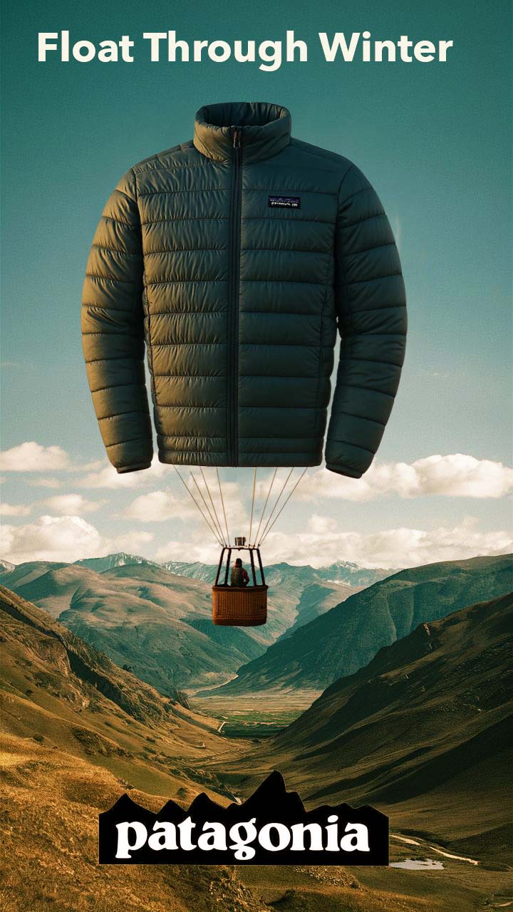 Insight The Nano Puff feels weightless like air, yet warms like much heavier outerwear. A jacket that disappears on your shoulders but defeats the cold. Idea The Featherlight Furnace. So light it lifts you. A jacket so warm and weightless it behaves like a hot-air balloon. Execution Stunt: A full scale Nano Puff hot-air balloon touring major cities, proving the idea for real. Digital and Social: Motion spot of the jacket rising skyward on its own. AR experience letting people fly a floating Nano Puff over their skyline or trail.