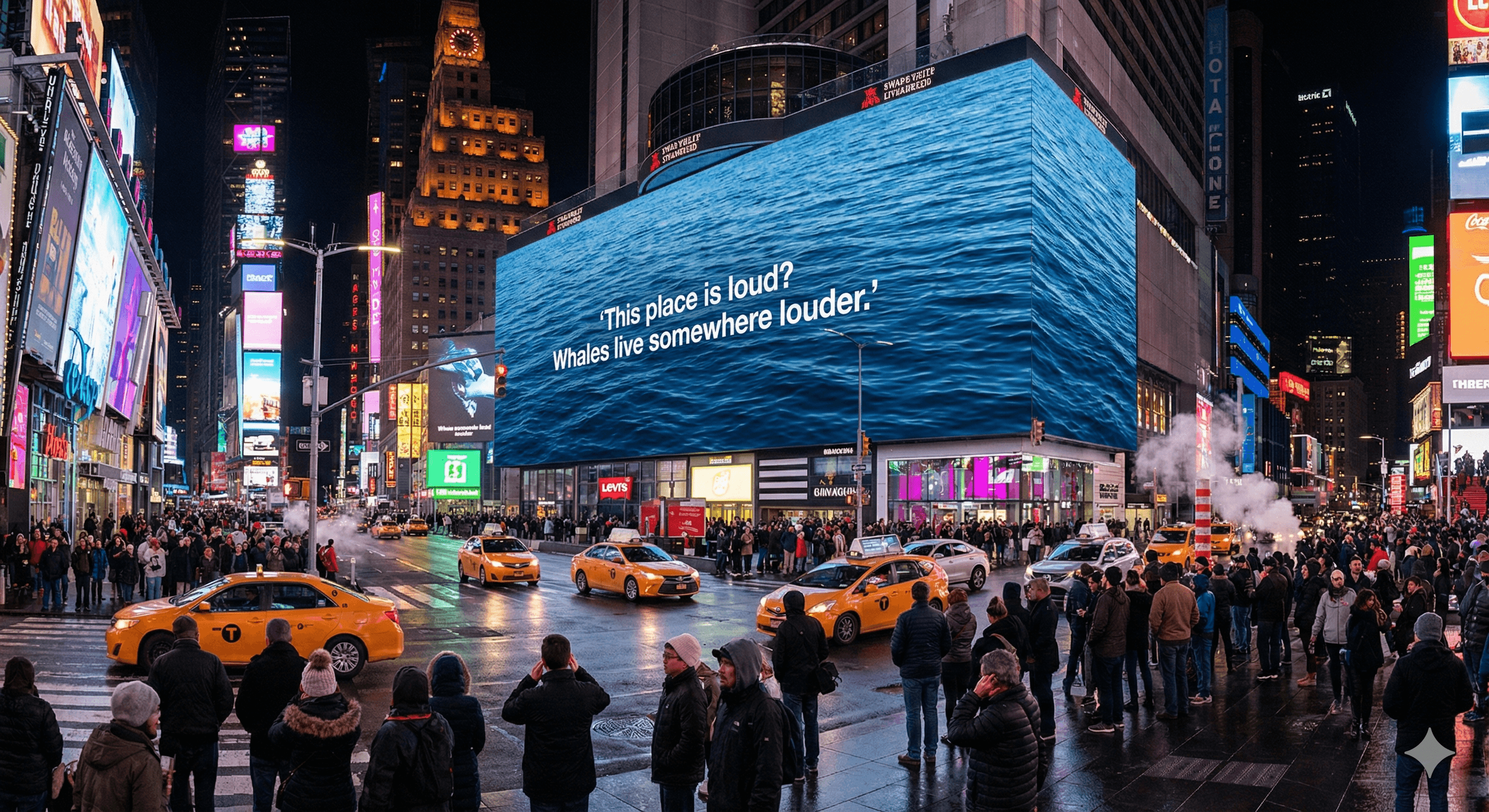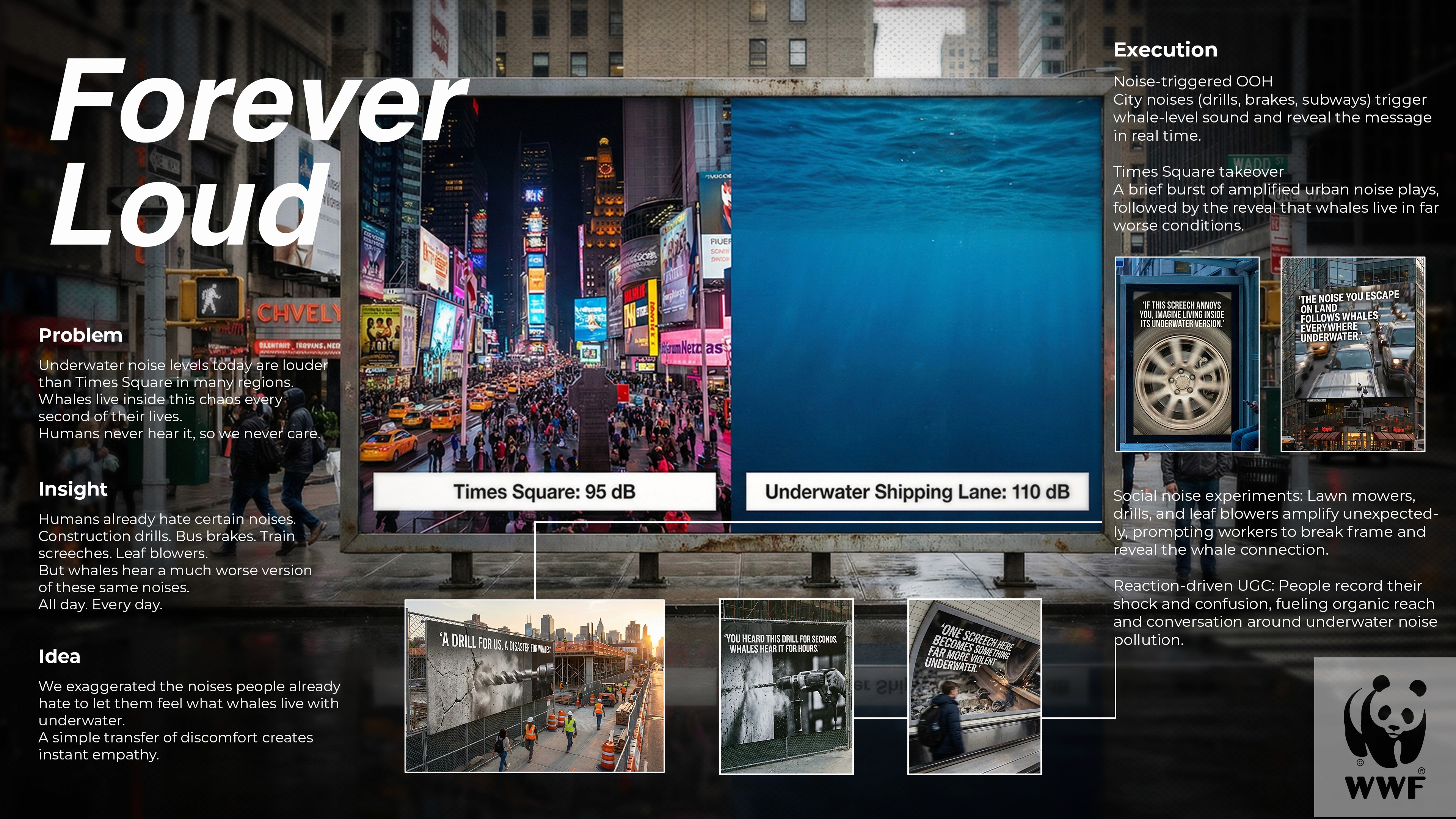 Problem Underwater noise levels today are louder than Times Square. Humans never hear it, so we never care. Insight Humans already hate certain noises. Construction drills. Bus brakes. Train screeches. Leaf blowers. But whales hear a much worse version of these same noises. Big idea Forever Loud We exaggerate the noises people already hate to let them feel what whales live with underwater. Executions We hijacked the loudest moments of daily city life and compared them to the far louder noise whales live in. OOH at construction sites, subways, bus stops, and Times Square. A hero film captured the shock of amplified human noises before showing whales enduring even worse. Social noise experiments showed everyday people reacting to exaggerated sounds, then learning the underwater truth.